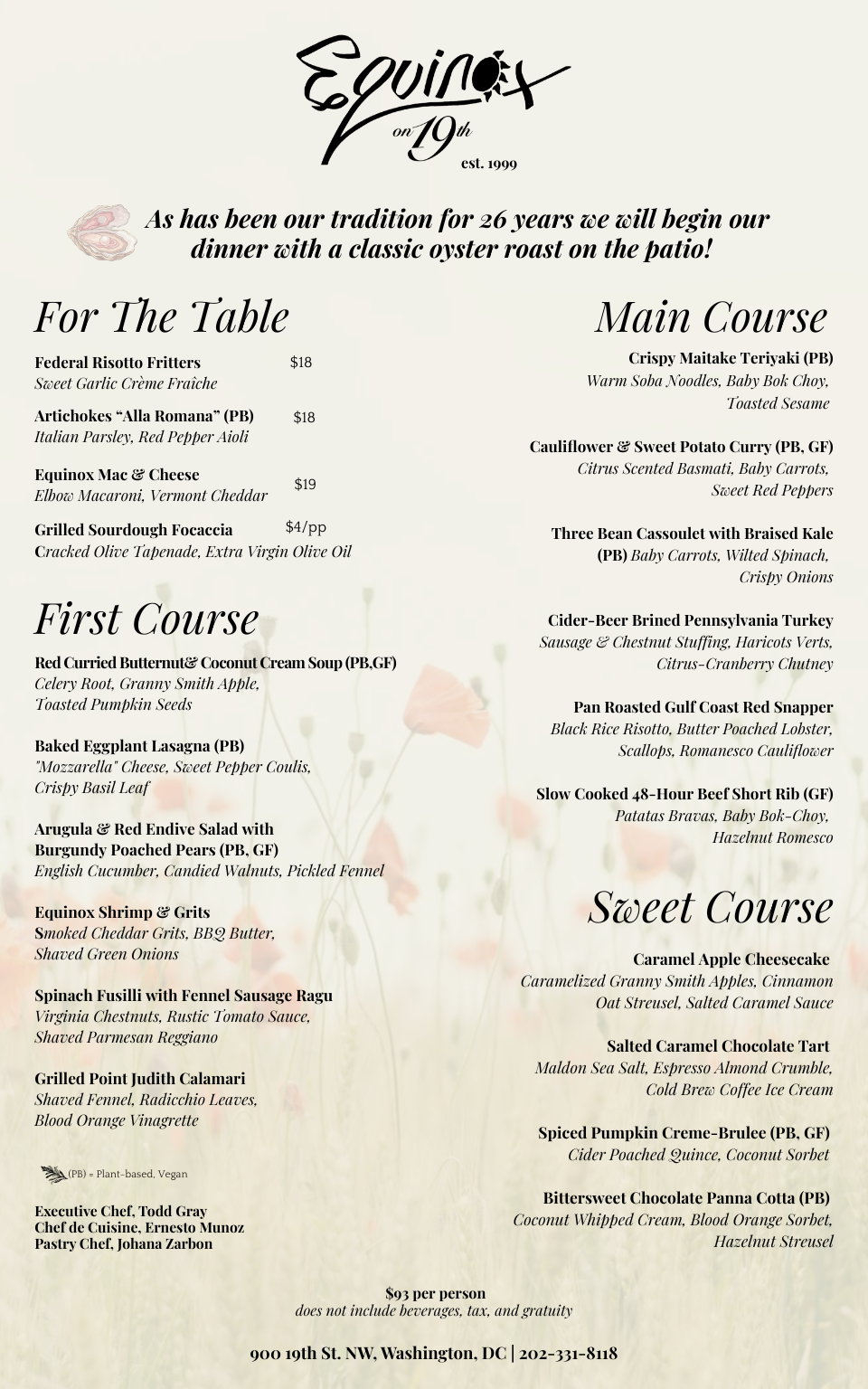 Three courses: $93 per guest + beverage, tax, and gratuity